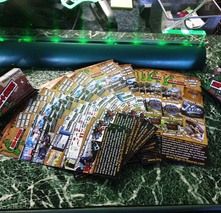 Our brochures are printed on high quality glossy stock. They are double sided and UV coated, featuring sharp text and full color graphics. Are you ready to get serious about advertising? Call Sign-O-Saurus today.